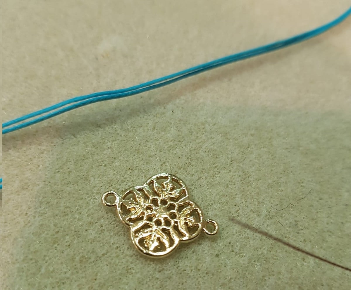 במידה ונרצה להשחיל חוט בד לשני חורי התליון שיש בתמונה, נצטרך להעזר בחוט תפירה דקיק ופשוט.